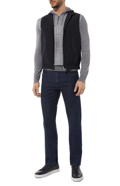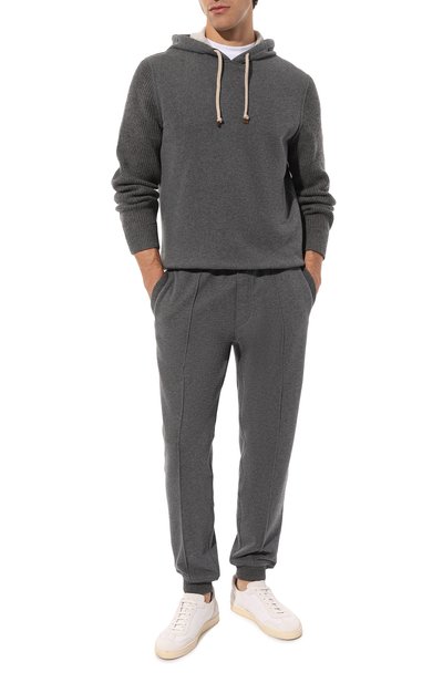 Серое меланжевое худи получилось одновременно легким и теплым. Вместо привычного футера выбрали мягкий эластичный трикотаж из тонкой шерсти и отборного длинноволокнистого кашемира. Прямую модель оставили без карманов, а в кулиску на капюшоне продели шнур с серебристыми эглетами.