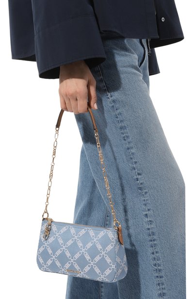 Небольшая черно-белая сумка Wythe с одним отделением, застегивающимся молнией, сшита из фактурного текстиля с жаккардовым узором Empire Logo в виде инициалов Майкла Корса. Короткая ручка, съемный плечевой ремень и отделка выполнены из матовой кожи. В аксессуар поместятся телефон, картхолдер и ключи.