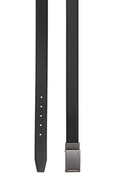 Ремень изготовили из кожи с гладкой лицевой стороной. Пряжку дополнили тиснеными вставками, а тренчик — выгравированным логотипом бренда. Лаконичная модель сможет вписаться в офисный образ.