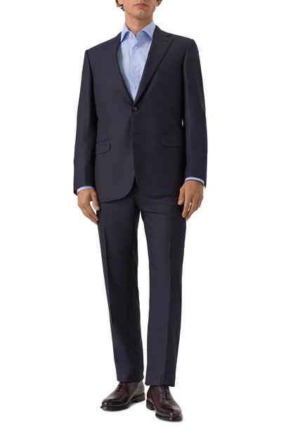 Костюм из ткани на основе хлопка и льна органично дополнит офисный гардероб. Пиджак с высокими шлицами сзади дополнили тремя карманами, а брюки с защипами и стрелками – четырьмя.