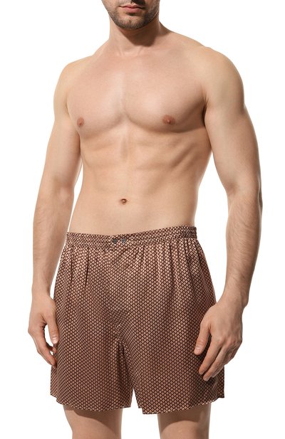Для пошива свободных коричневых боксеров швейцарские дизайнеры выбрали чистый шелк с фуляровым мотивом. Тонкий и в то же время прочный материал хорошо пропускает воздух, дарит телу приятную прохладу в жару и сохраняет тепло при более низких температурах. Модель дополнена широким эластичным поясом, который застегивается на две перламутровые пуговицы.