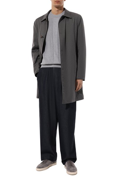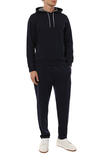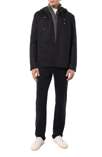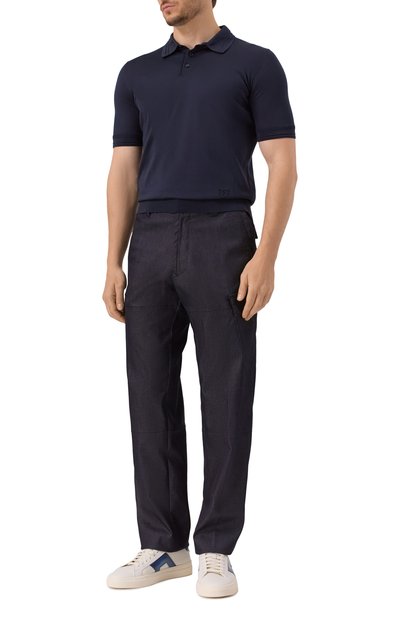 Для создания темно-синих брюк, окрашенных в готовом виде, использовали тонкий габардин из отборного американского хлопка пима. Особенно приятная на ощупь модель с прорезными карманами не препятствует циркуляции воздуха, а благодаря добавлению в состав ткани эластана изделие комфортно садится по фигуре и обеспечивает свободу движения. Наши стилисты предлагают собрать расслабленный образ с футболкой и кардиганом, завершив его кедами.