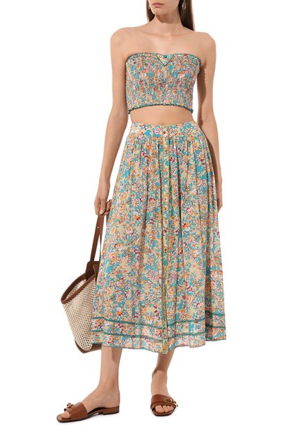 Укороченный топ-бюстье с мелким цветочным принтом поможет продемонстрировать идеальную осанку. Для изготовления эластичной гофрированной модели, комфортно облегающей фигуру, использовали нежную дышащую вискозу, которую произвели экологичным способом. Изделие с фестончатыми краями декорировали спереди треугольной вставкой с синей пуговицей.