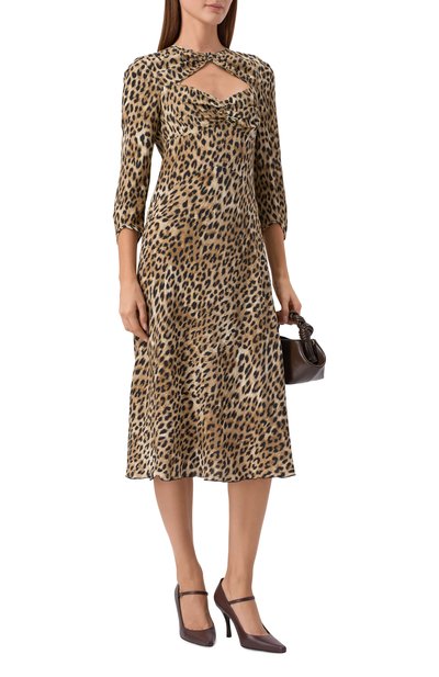 Легкое платье с глубоким V-образным вырезом сшили вручную из нежного вискозного крепа. Струящийся дышащий материал изготовили из целлюлозы возобновляемых лесов, сделав изделие экологичным. Модель без застежки, напоминающую силуэтом кимоно, дополнили поясом-лентой.