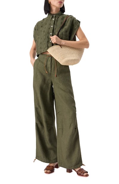 Для создания розового топа с цветочным принтом использовали экологически чистый сертифицированный хлопок Better Cotton, который отлично пропускает воздух и особенно приятен на ощупь. Спереди предусмотрели планку с пуговицами, а по бокам от нее заложили мелкие симметричные защипы. Модель с широкой горловиной и эластичными краями можно носить на плечах или слегка приспустив лямки.