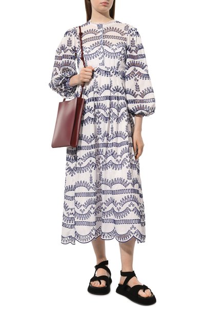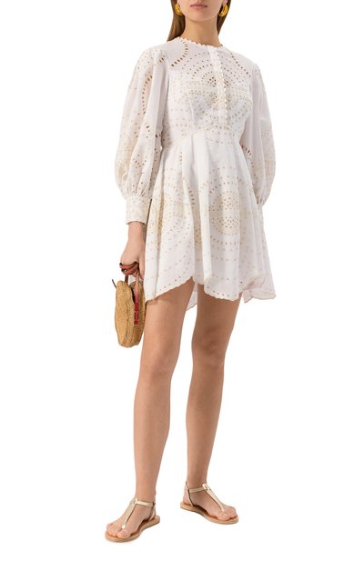 Разноцветное мини-платье с круглым отложным воротником и заниженной линией талии сшито из тонкого мягкого хлопка с красочным принтом. Гладкая ткань отлично пропускает воздух, а свободный крой не ограничивает движения. Планка с пуговицами и манжеты длинных рукавов отделаны узкой волнистой каймой.