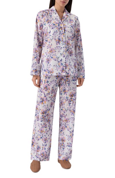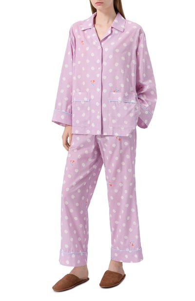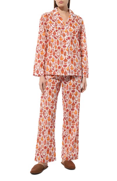 Пижама с разноцветным принтом в виде планет и зодиакальных созвездий объединила в себе красоту и комфорт. Для пошива свободной рубашки с длинными рукавами и брюк с эластичным поясом-кулиской использовали тонкий хлопковый батист, который будет поддерживать комфортный микроклимат даже в жаркую погоду.