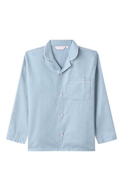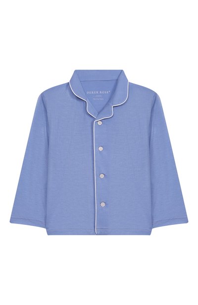 Для изготовления пижамы в голубую вертикальную полоску выбрали мягкий отборный хлопок. Приятный на ощупь материал безопасен для нежной кожи ребенка, сохраняет тепло и пропускает воздух, поддерживая оптимальный микроклимат. Рубашку с одним карманом и английским воротником дополнили свободными брюками с эластичным поясом.