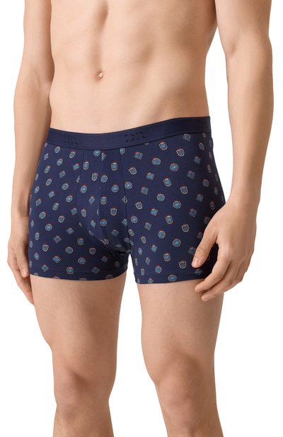 Темно-синие боксеры с красным графичным паттерном выполнили из тонкого трикотажа на основе длинноволокнистого хлопка пима. Он особенно приятно ощущается на теле и хорошо пропускает воздух, а чтобы материал лучше тянулся, в состав добавили эластан. Трусы дополнили плоским поясом с жаккардовой повторяющейся эмблемой марки.