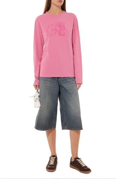 Для изготовления свободного свитшота использовали мягкий хлопковый футер. Приятный на ощупь материал с фактурной изнанкой поддерживает оптимальный микроклимат, сохраняя комфорт в прохладную погоду. С ярко-розовым принтом в виде подтаявшего рожка мороженого спереди зарифмовали логотип марки, основанной Джил Сандер, под горловиной на спинке.