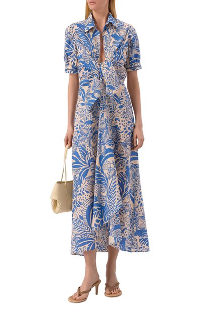 Переднюю часть приталенного платья Алессандро дель Аква оставил максимально лаконичной, а сзади расположил ромбовидный разрез, демонстрирующий спину. Модель длиной чуть ниже колен выполнили из нежной вискозной ткани с монохромным рисунком, словно скопированный со старинной гравюры. Изделие с отворотами на коротких рукавах застегивается потайной молнией и пуговицей.