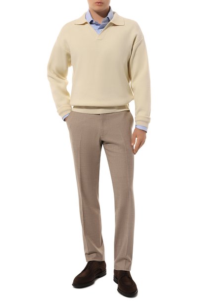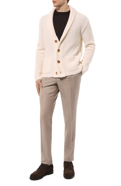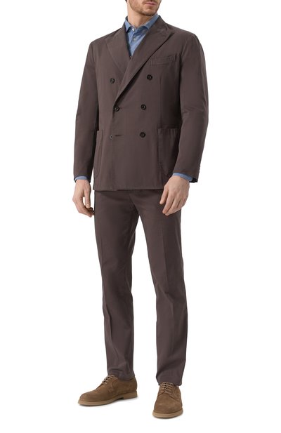 Коричневые дерби сделали менее формальными за счет неравномерного окрашивания и перфорированного узора, позаимствованного у брогов. Для пошива модели выбрали выделанную вручную замшу, устойчивую к появлению потертостей и царапин. Пара, выполненная по технологии Blake, получилась особенно прочной и легкой.