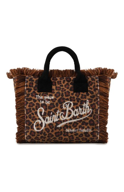 Коричневую сумку с леопардовым узором сшили из прочного фактурного текстиля. Спереди и сзади аксессуар украсили логотипом бренда, вышитым белыми нитями. По краям модель со съемным плечевым ремнем декорировали бахромой. Внутрь поместятся кошелек, бутылка воды, смартфон и ключи.