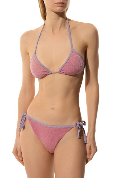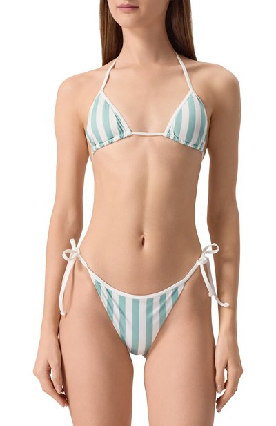 Мягкие чашечки этого бра выполнены из кремового хлопка френч терри с характерной махровой фактурой. Их треугольную форму подчеркивают гладкие узкие канты сиреневого и лимонно-желтого оттенков, которые переходят в бретели-завязки. Палитру дополняет такой же тонкий пастельно-розовый пояс.