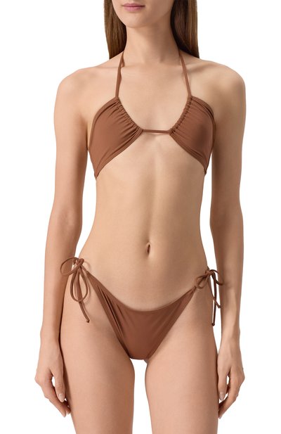 Об источнике вдохновения для создания треугольного бра — экзотическом мире африканских саванн — говорит и оттенок коричневой глины, и принт в виде пасущихся зебр. Модель приято ощущается на коже и надолго сохранит первоначальный цвет (легкий быстросохнущий полиамид не выгорает на солнце). Отрегулировать посадку по фигуре позволяют узкий пояс и бретели, завязывающиеся на шее.