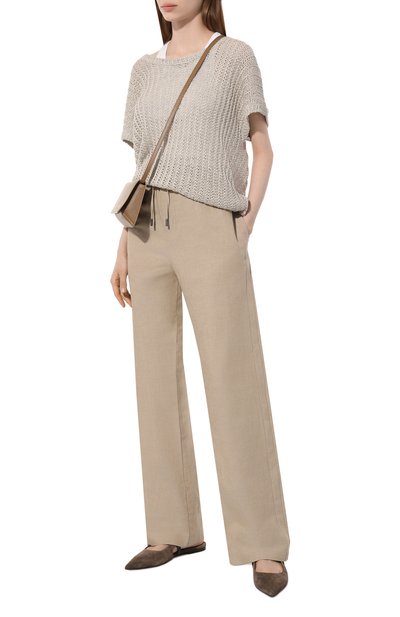 Для пошива брюк прямого кроя выбрали мягкий шерстяной габардин, поддерживающий оптимальный микроклимат. Приятная на ощупь модель с прорезными карманами не сковывает движения и визуально вытягивает силуэт за счет высокой посадки и отглаженных стрелок. Наши стилисты предлагают создать монохромный образ в бежевых оттенках с жилетом, заве ршив его туфлями.