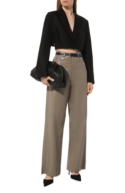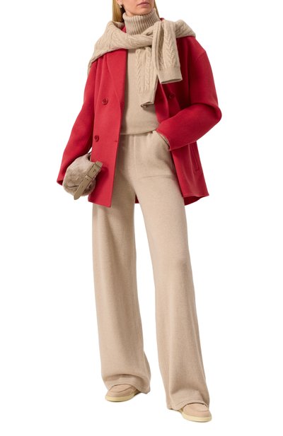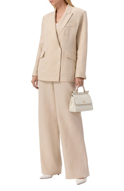 Для пошива брюк прямого кроя выбрали мягкий шерстяной габардин, поддерживающий оптимальный микроклимат. Приятная на ощупь модель с прорезными карманами не сковывает движения и визуально вытягивает силуэт за счет высокой посадки и отглаженных стрелок. Наши стилисты предлагают создать монохромный образ в бежевых оттенках с жилетом, заве ршив его туфлями.