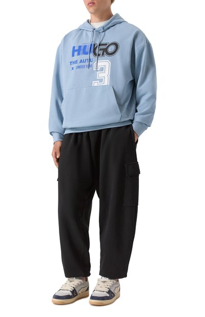Спинку худи Nazardo декорировали крупным логотипом и годом основания марки, написанным арабскими и римскими цифрами. Миниатюрную версию фирменной символики повторили спереди. Модель Loose fit с карманом «кенгуру» сшили из хлопкового трикотажа френч терри.