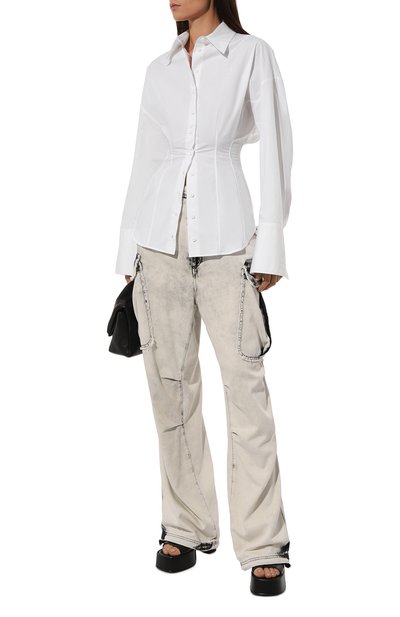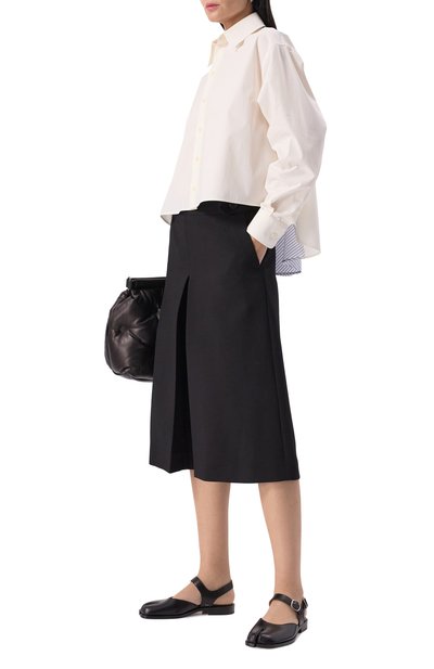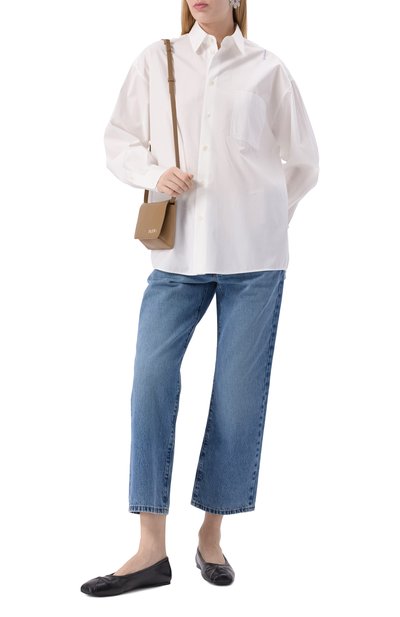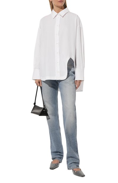 Широкий разре з слева добавил асимметрии базовой рубашке из белоснежного хлопкового поплина. Пропорции модели увеличили, поэтому она драпируется крупными складками на удлиненной спинке. Дополнительный акцент создают подчеркнуто высокие манжеты, которые почти полностью скрывают кисти рук. Незаметной остается миниатюрная эмблема марки, вышитая слева от планки с пуговицами.