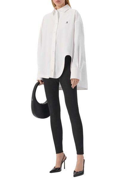 Широкий разрез слева добавил асимметрии базовой рубашке из белоснежного хлопкового поплина. Пропорции модели увеличили, поэтому она драпируется крупными складками на удлиненной спинке. Дополнительный акцент создают подчеркнуто высокие манжеты, которые почти полностью скрывают кисти рук. Незаметной остается миниатюрная эмблема марки, вышитая слева от планки с пуговицами.