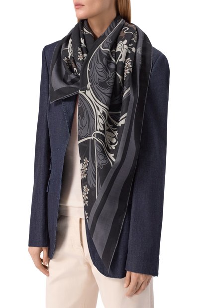 Черный платок в белый горох вошел в коллекцию Mambo, вдохновленную стилем 1940-50-х годов. Для создания почти невесомой модели выбрали мягкий шелковый твил с деликатным блеском. Аксессуар легко драпируется, позволяя экспериментировать с формой узла, и быстро восстанавливается после развязывания.
