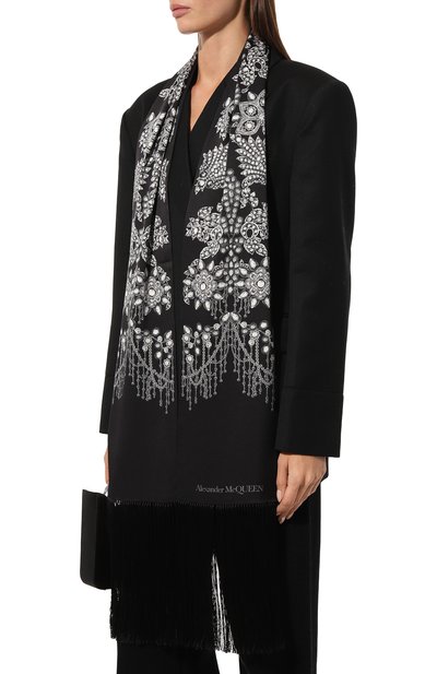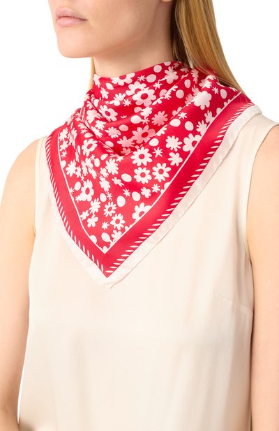 Длинный широкий шарф вошел в коллекцию Mambo, вдохновленную стилем 40-х и 50-х годов. Аксессуар с обработанными вручную краями выполнили из жатого шелкового креп-шифона. Изделие можно не только носить на шее или голове, но и продеть в шлевки пояса.