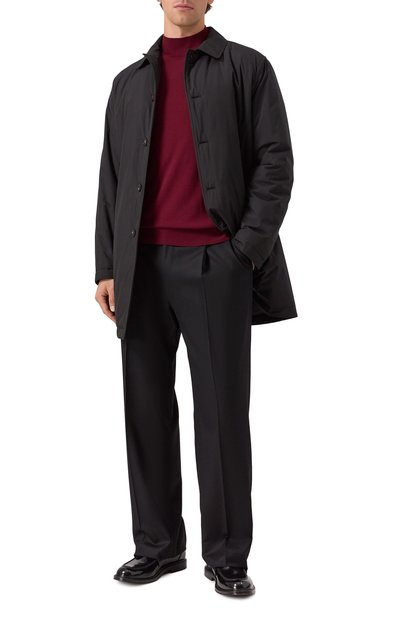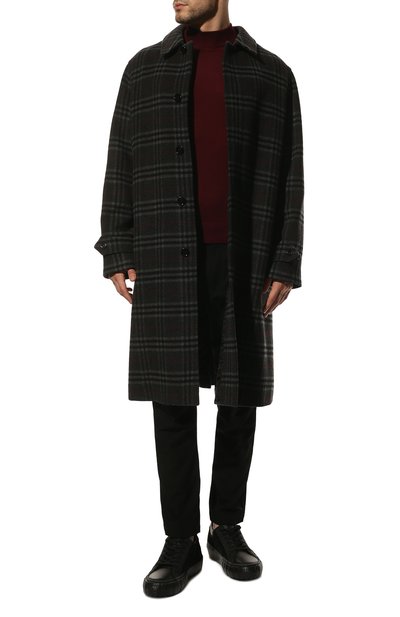 Водолазку с высоким воротником, эластичными манжетами и поясом в рубчик выполнили из шерстяного трикотажа. Сзади изделие украсили небольшой брендированной нашивкой.