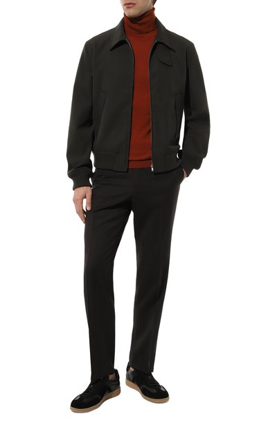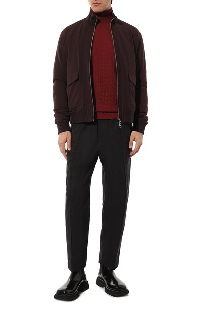 Водолазку с высоким воротником, эластичными манжет ами и поясом в рубчик выполнили из шерстяного трикотажа. Сзади изделие украсили небольшой брендированной нашивкой.