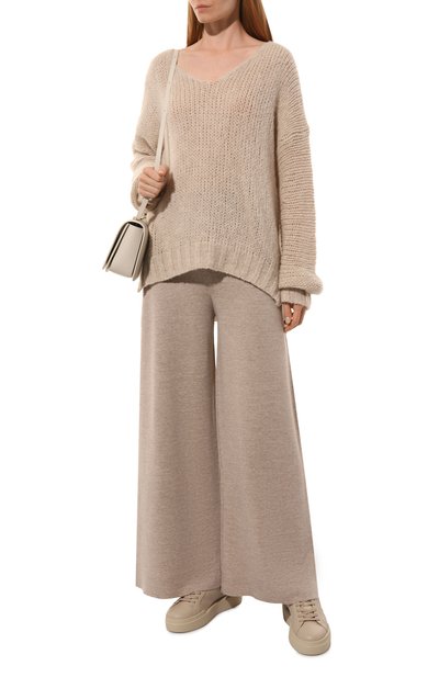 Свитер с заниженной линией плеч и круглой горловиной связан из тонкой пряжи на основе шерсти и кашемира. Модель украшена миниатюрными пайетками, с блеском которых перекликается золотистая люрексовая нить.