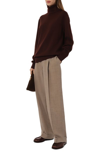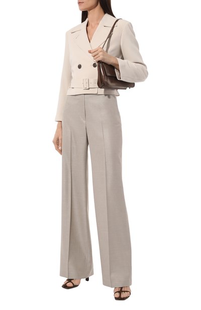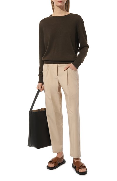 Свободные вельветовые брюки со стрелками и четырьмя карманами будут уместны и в офисе с нестрогим дресс-кодом, и в ресторане. Заднюю шлевку укороченной модели с завышенной посадкой декорировали цепочками мониль.