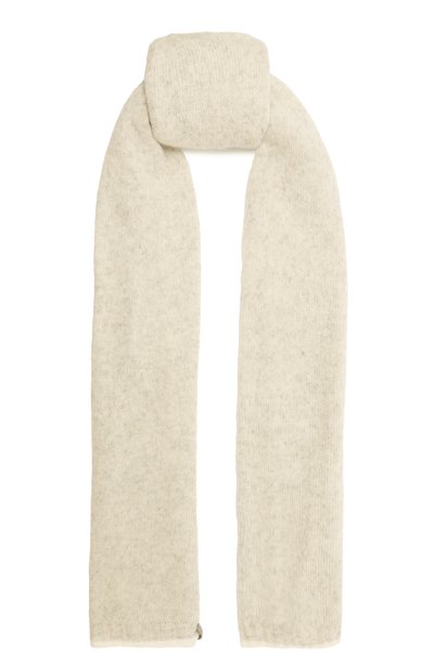Нарочито длинный шарф выполнили из смеси шерсти и мохера лицевой вязкой, а края — английской резинкой. На одной из манжет расположили ярлык с фирменной цепочкой мониль.