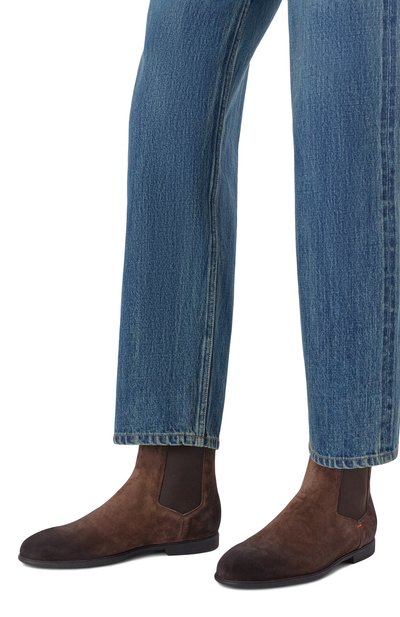 Коричневые челси с высоким голенищем выполнили из мягкой бархатистой замши. Рант модели выложили символичными для марки, основанной Брунелло Кучинелли, цепочками мониль. Пару установили на массивную подошву с устойчивым протектором, снижающим риск поскользнуться на мокрой дороге.