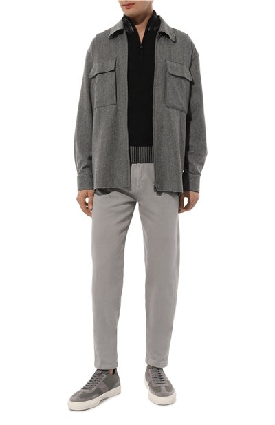 Джемпер с отделкой из полиэстера связали из тонкой шерсти. Высокий воротник-стойку, декорированный сзади очертанием акульего плавника, дополнили спереди молнией, которую скрыли под планкой с потайной пуговицей.