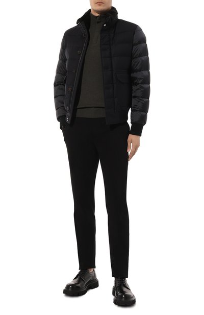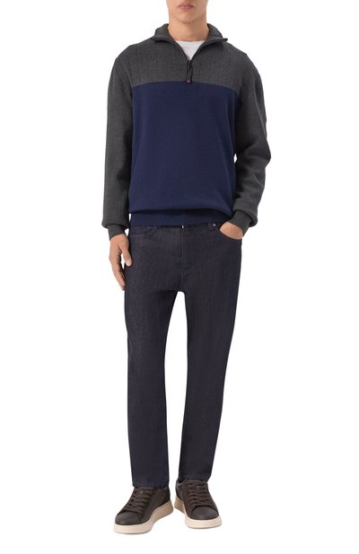 Джемпер с воротником-стойкой, застегивающимся пуговицами под планкой, изготовили из шерстяного трикотажа. Вдоль плечевых швов изделие дополнили вставками из полиэстера. Их, как и эластичные манжеты, подчеркнули контрастным кантом.