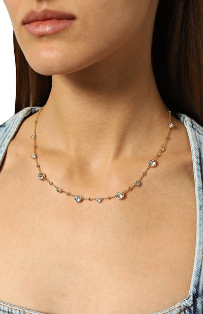 Регулируемое по длине колье с карабином составили из четырех позолоченных латунных цепочек. Один ярус декорировали металлическими бусинами, а три других – белыми и черными кристаллами разных огранок.