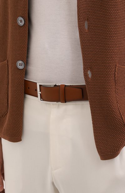 Замшевый ремень стандартной ширины выполнен из особо прочной яловой кожи, которая хорошо держит форму. Серебристую пряжку изготовили из брашированного металла и дополнили выгравированным логотипом.
