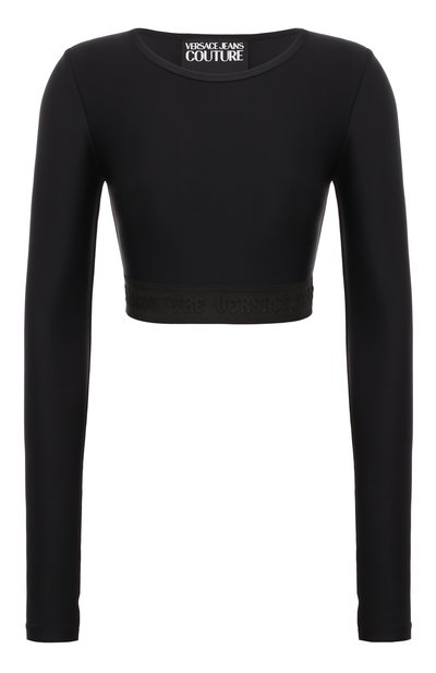 Укороченный топ выполнили из полиамида и эластана. Пояс украсили объемным логотипом бренда. Модель дополнили длинными рукавами с манжетами-митенками, которые позволяют рукам не скользить во время занятий спортом.