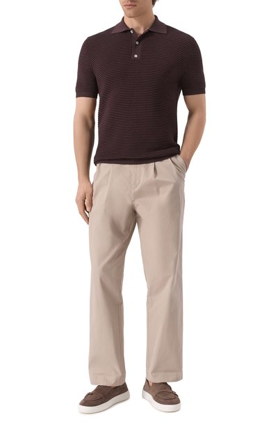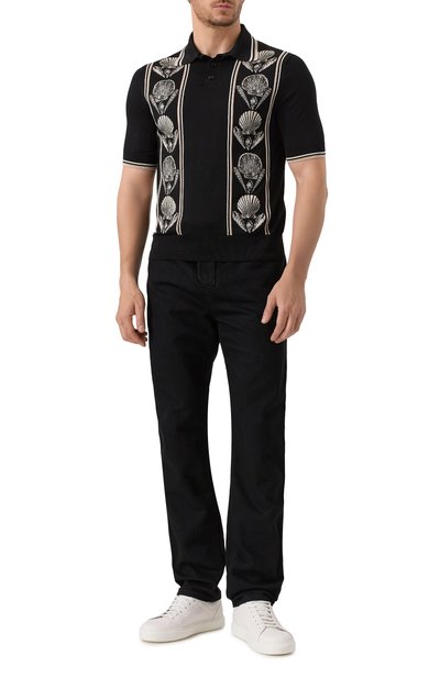 При создании черного поло внимание акцентировали на фактурном знаковом паттерне, вдохновленном версальскими садовыми лабиринтами. Декор модели из тонкой шерсти завершили эластичной отделкой в контрастную полоску. Изделие органично дополнит повседневный образ и со строгими брюками, и с потертыми джинсами.
