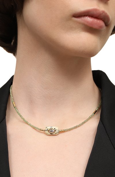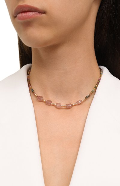Розовые бусины на этом колье чередуются с латунными, покрытыми 24-каратным золотом. Украшение дополнили подвеской со вставкой огранки «маркиз». Аксессуар с регулируемой цепочкой застегивается карабином.