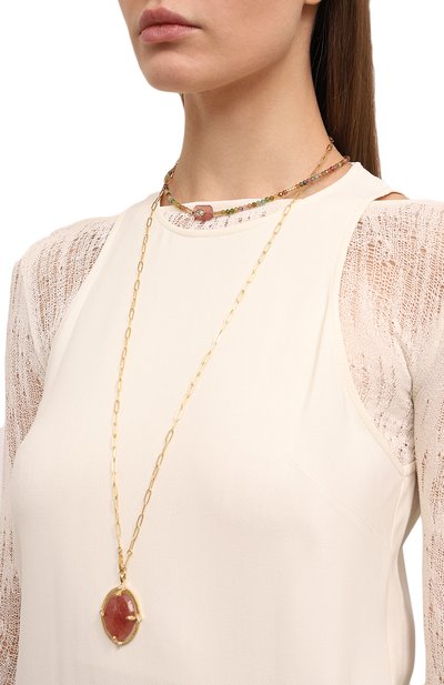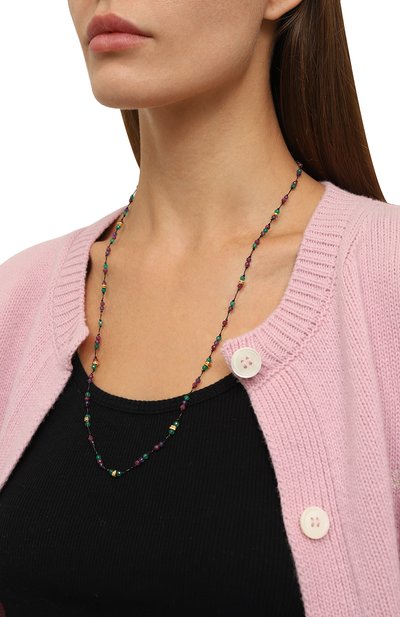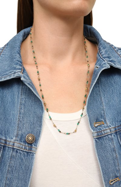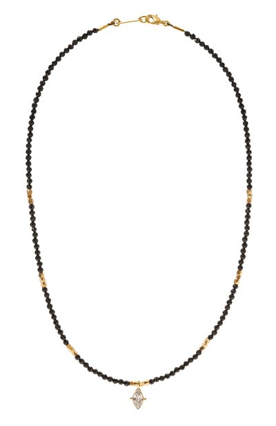 Для изготовления регулируемого колье Gigi с карабином использовали ограненную шпинель, которую разбавили латунными бусинами. В центре — подвеска с кубическим цирконием.