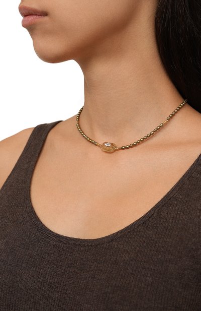 Колье Locky выполнили из позолоченной латуни, дополнив изделие гранеными бусинами цоизита. Модель с круглой подвеской застегивается карабином.