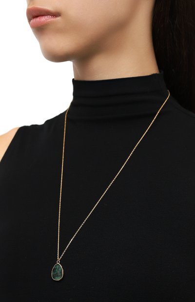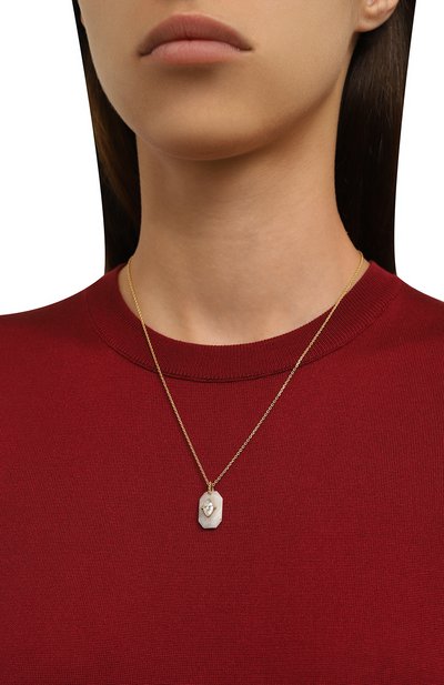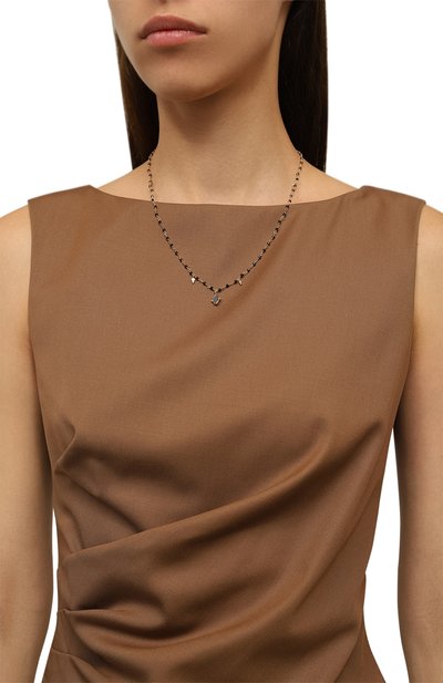 Длинное регулируемое колье Mirage с брендированной пластиной выполнили из жемчужных бусин и небольших шармов, закрепив их узлами. Модель украсили подвеской из лунного камня со вставкой из циркония.