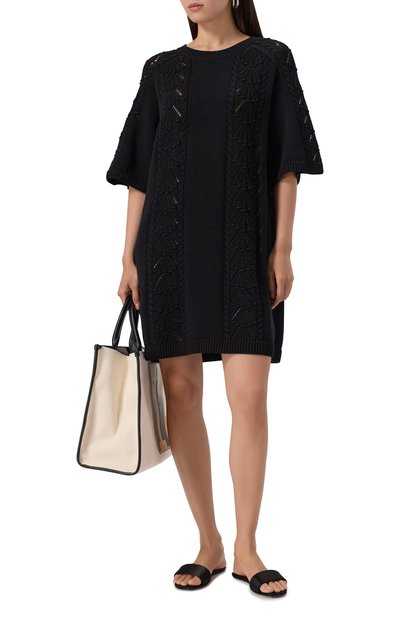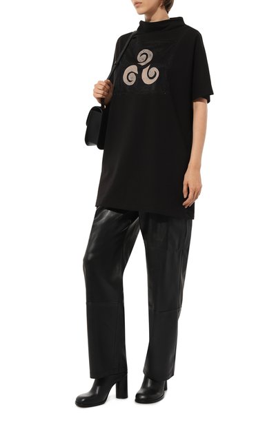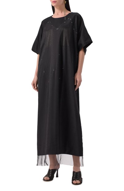 Прямое черное миди-платье Demeter с короткими цельнокроеными рукавами будет одинаково хорошо смотреться и с босоножками на шпильке, и с обувью без каблука. Для пошива модели с высокой шлицей сзади использовали шелковый твил. Изделие с воротником-стойкой дополнили на V-образном вырезе шнуровкой.