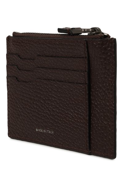 Компактный футляр цвета горького шоколада входит в коллекцию Grained — его сшили из зерненой телячьей кожи, которой не страшны потертости и царапины. На задней панели разместили плоский карман, а внутри — основной отделение и отсеки для банковских карт. Модель с застежкой на кнопку декорировали на передней панели тисненым логотипом.
