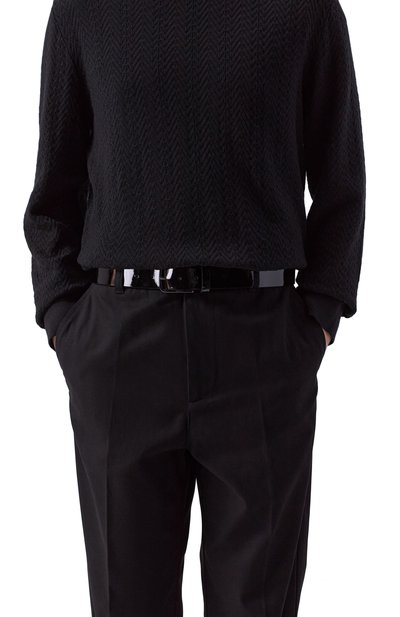 Ремень средней ширины сшили из мелкозернистой кожи, отполированной до деликатного блеска. Аксессуар с контрастной строчкой фирменного алого оттенка регулируется прямоугольной лаконичной пряжкой с выгравированным логотипом.