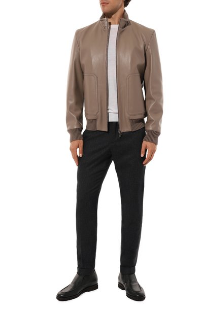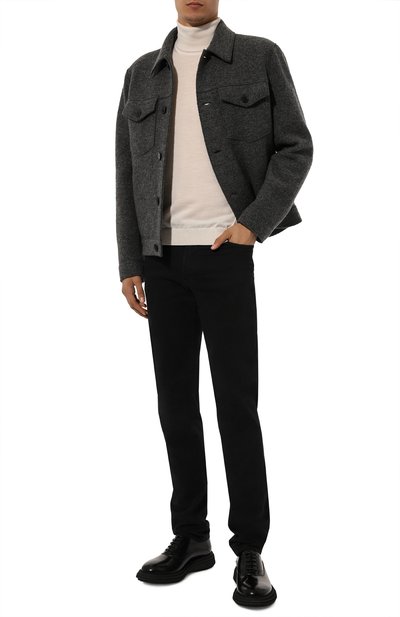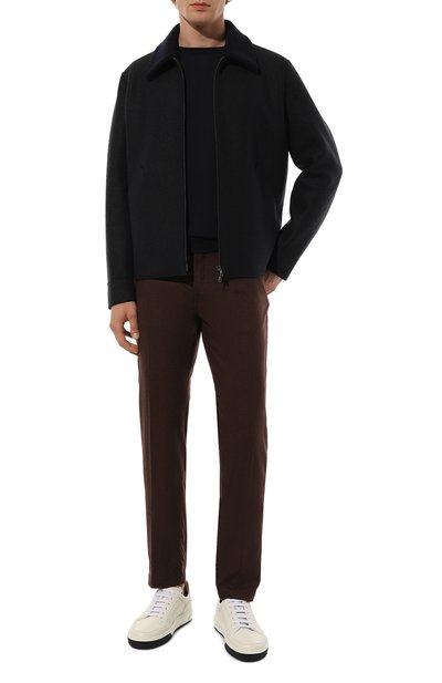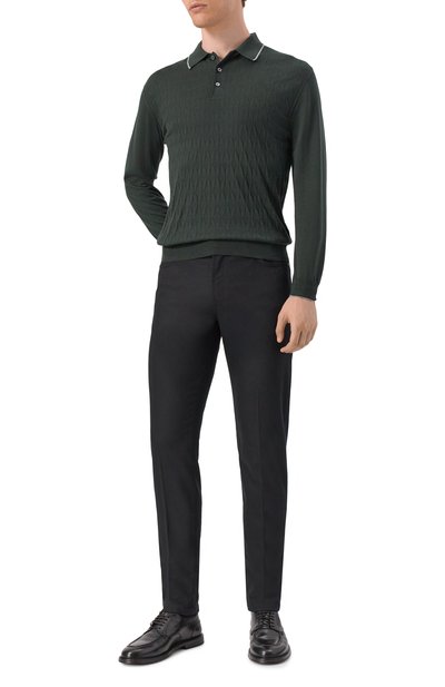 Темно-серые брюки зауженного кроя выполнили из бархатистой мягкой ткани на основе отборной шерсти и кашемира: такой материал поддерживает оптимальный микроклимат и почти не мнется, а благодаря добавлению в состав стрейчевых нитей, изделие немного тянется, комфортно облегая фигуру. Карман спереди украсили небольшой серебристой деталью в виде фирменной маски Пульчинеллы. Таким же элементом дополнили и патч на поясе сзади.