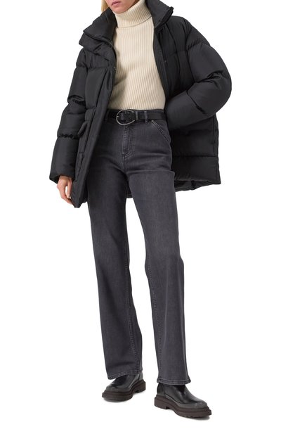 Черные ботинки напоминают носки, установленные на тонкую подошву с низким квадратным каблуком. Впечатление формирует плотный трикотаж с жаккардовой буквой К на голенище и узкой эластичной манжетой. Для прочности модель продублировали изнутри тонкой кожей. Чтобы пару без застежки было легче надевать и снимать, сзади предусмотрели петлю.