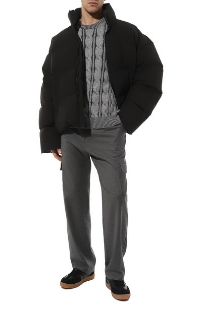 Свитер из кашемира и шерсти украсили геометрическим узором спереди, узкой полоской сзади, а рукава оставили однотонными. Молнию на горловине скрыли под однотонным кантом. На спинке – миниатюрный логотип марки.