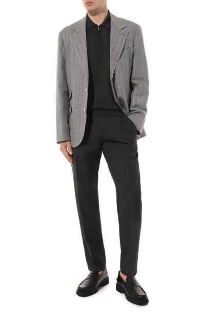 Воротник, плечевые швы, манжеты и низ темно-серого поло подчеркнули узким бежевым кантом. В тон ему выполнили внутреннюю сторону пуговичной планки и монограмму SR на поясе. Модель прямого кроя выполнили из тонкого шерстяного трикотажа с добавлением шелка и кашемира.