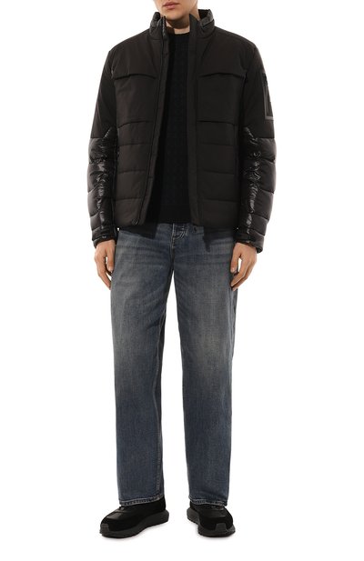 Темно-серый пуховик с двойным воротником сшили из плотной ламинированной ткани на основе полиэстера и шерсти: такой материал отталкивает влагу и поддерживает оптимальный микроклимат даже в капризную погоду. Стеганую куртку с двумя внешними и внутренним карманом утеплили слоем отборного гусиного пуха с добавлением пера. Модель застегивается молнией и штормовой кнопочной планкой.